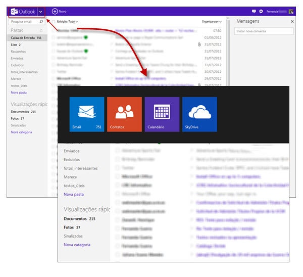 Entrou no e-mail? No canto superior esquerdo da página, onde está escrito “Outlook”, fica o menu principal de serviços. Ao clicar na setinha, aparecem os botões “Email”, “Contatos”, “Calendário” e “SkyDrive”.