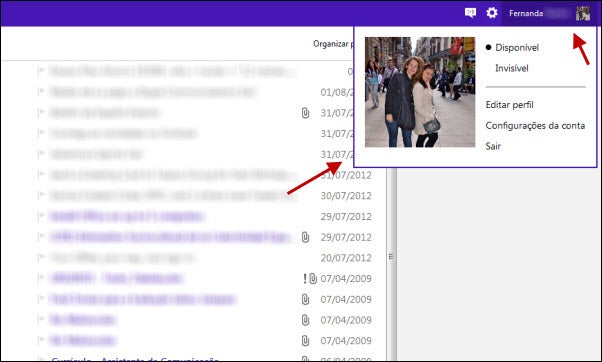 Clicando sobre o seu nome, no canto superior direito da página, você define se quer estar disponível ou invisível para seus amigos e edita seu perfil pessoal, assim como os detalhes da sua conta Microsoft.