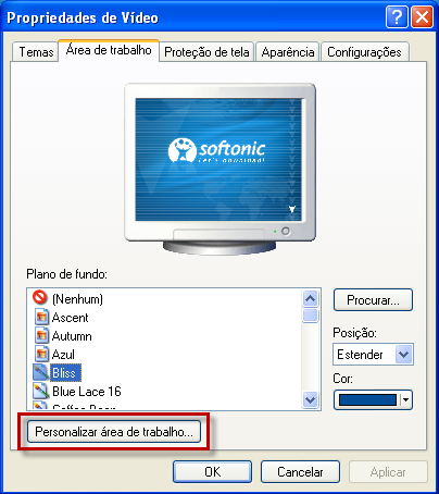 1. Clique com o botão direito do mouse em qualquer parte da Área de Trabalho e selecione “Propriedades”. Na janela que foi aberta, selecione a aba “Área de Trabalho” e clique no botão “Personalizar área de trabalho”: