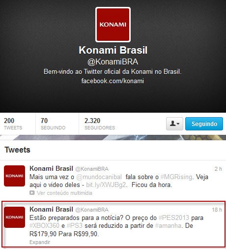 A Konami Brasil anunciou hoje a sua nova tabela de preços via Twitter, em resposta à mesma manobra comercial realizada há três dias pela Warner Games, responsável pelo PES 2013.