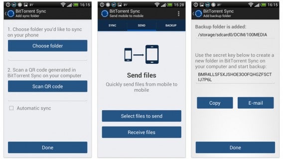 O BitTorrent Sync para Android roda em dispositivos com Android 2.2 ou superior, o que significa que funciona em praticamente todos os celulares e tablets atuais. Os usuários podem fazer backup de fotos, vídeos e diversos outros arquivos diretamente do seu Android. Por enquanto, não há existe uma versão do BitTorrent Sync para iOS, mas a desenvolvedora afirma que está a caminho.