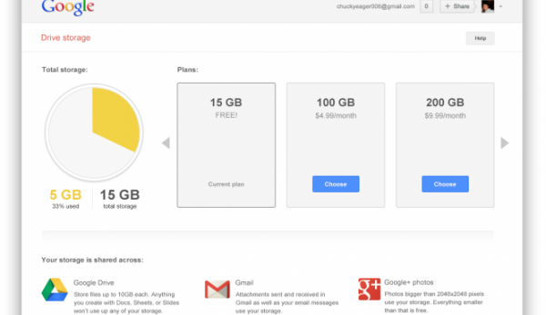 O Google acaba de modificar seus serviços de armazenamento online. Agora, os usuários passam a contar com um total de 15GB para guardar arquivos na internet, espaço que é compartilhado pelos serviços Gmail, Drive e Google+ (Android | iPhone). A novidade chegará a todas as pessoas que têm uma conta nesses serviços ao longo das próximas semanas.