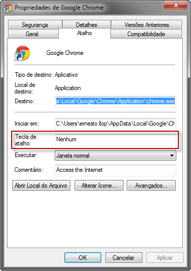 Nas propriedades do ícone/programa, abra a aba “Atalho” e encontre o campo “Tecla de atalho”: