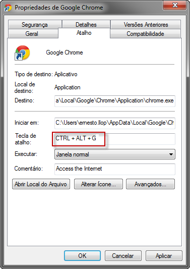 No exemplo acima, eu selecionei as teclas Ctrl + Alt + G para abrir o Google Chrome. Assim, sempre que eu pulsar estas três teclas, o navegador abrirá automaticamente. Muito prático, não é?