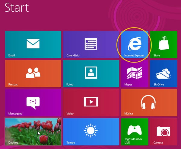 Nada mais fácil do que abrir o IE 10 a partir da interface Metro do Windows 8. Basta apertar o quadradinho “Internet Explorer” e começar a navegar.
