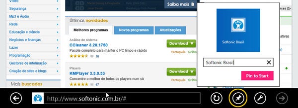 Na parte inferior da tela, aparecem os botões para avançar e retroceder e a barra de navegação, que pode ser usada também para buscas. O Internet Explorer sugere resultados para as pesquisas enquanto você digita na barra. Use o botão do clipe (“Pin to Start”) para criar um atalho no painel Metro para a página que você está vendo.