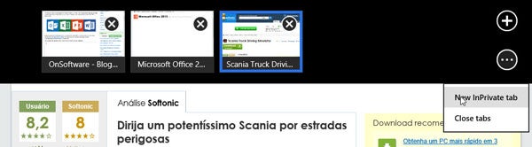 Clique com o botão direito do mouse em qualquer lugar do navegador para ver as miniaturas das abas abertas e poder passar de uma para outra. Clique no símbolo + para abrir uma nova aba. O botão das reticências serve para abrir uma sessão anônima (“New InPrivate Tab”) e navegar sem guardar rastros, ou para fechar todas as abas abertas de uma vez só (“Close tabs”).