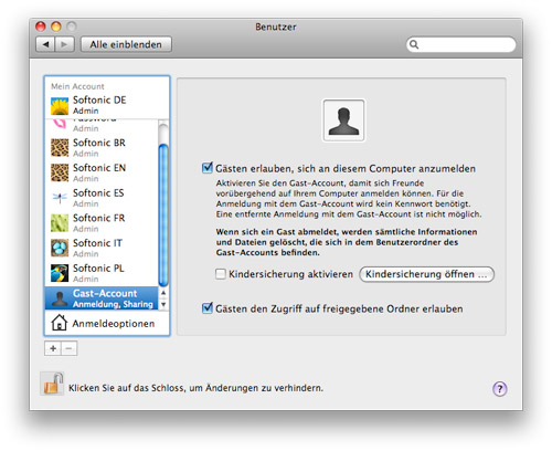 Um dieses Sicherheits-Problem zu lösen, stellt OS X den so genannten Gast-Account zur Verfügung. Diesen muss man aber erst einmal aktivieren. Dazu geht man folgendermaßen vor: Zunächst öffnet man die Nutzerverwaltung in den Systemeinstellungen. In der linken Seite des Fensters befindet sich eine Liste der Accounts auf diesem Rechner. Der Gast-Account ist standardmäßig ausgegraut, weil inaktiv. Um diesen Zugang zu aktivieren, muss man zunächst das Schloss am unteren Fensterrand öffnen. Daraufhin setzt man einen Haken bei Gästen erlauben, sich an diesem Computer anzumelden. Auf Wunsch legt man mit Hilfe der Kindersicherung noch fest, was der Besucher in seinem temporären Account anstellen darf.