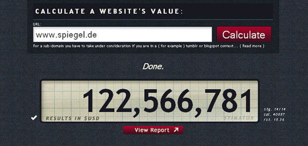 Im Internet tummeln sich höchst unterschiedliche Webpages. Professionelle Anbieter, Spezialisten, private Seiten und Blogs veröffentlichen Tag für Tag Millionen neuer Artikel. Die Popularität von Internetseiten kann man Anhand zahlreicher Faktoren wie etwa dem Google Page Rank oder aber auch dem Alexa-Rang ablesen. Wer schon immer mal wissen wollte, welchen Wert eine Webpage hat, der sollte bei stimator.com vorbeisurfen. Das kostenlose Tool errechnet auf Basis von Faktoren wie Bekanntheit, Verlinkung und Reichweite einen Wert für Internetseiten.
