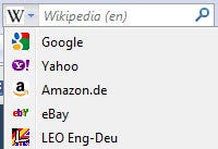 Das Suchfeld im Mozilla Firefox bietet schnellen Zugriff auf beliebte und häufig genutzte Suchmaschinen. Standardmäßig kommt der Browser mit Links zur Suche von Google, Yahoo, Amazon.de, Bing, eBay, Leo Englisch-Deutsch und der deutschen Wikipedia daher.