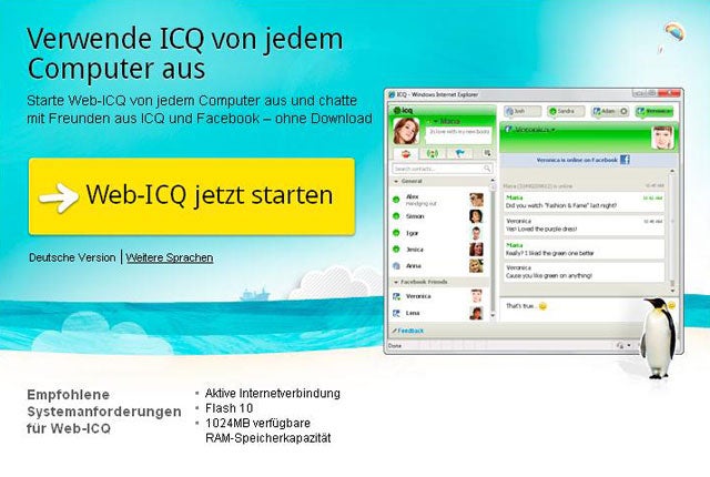Mit der kostenlosen Web App ICQ2Go nutzt man den beliebten Messenger von jedem beliebigen Computer aus. Neben einem ICQ-Account braucht man natürlich auch eine Internetverbindung. Nach dem Login öffnet sich im Internetbrowser die Freundesliste und man kann direkt los-chatten. ICQ2Go hat nicht so viele Optionen an Bord wie die installierbare Software, reicht aber völlig aus, um ein Schwätzchen zu halten.