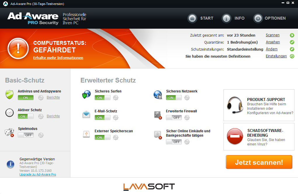 Wer für Virenschutz nichts zahlen will, hat jetzt ein weiteres Programm zur Auswahl. Mit Ad-Aware Free Antivirus+ 10 (Download) verwandelt sich der Anti-Malware-Klassiker Ad-Aware in einen vollwertigen Virenschutz. Der Entwickler Lavasoft hat die Software umfassend überarbeitet und tritt ab sofort in direkte Konkurrenz zu Freeware wie Avast, AVG, Avira und Panda.