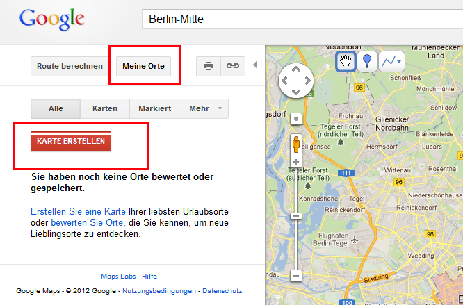 Klicken Sie in der linken Seitenleiste erst auf Meine Orte und anschließend auf Karte Erstellen.