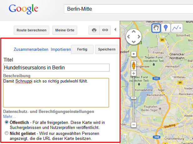 Mit Hilfe des blauen Markierwerkzeugs können Sie manuell Orte hinzufügen. Nach einem Klick auf den gewünschten Ort erscheinen Eingabefelder für Ortsname und Beschreibung.