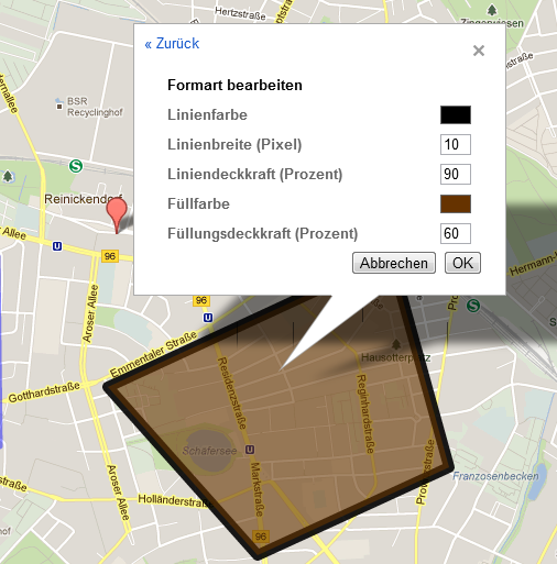 Auch hier können Sie Zusatzinformationen eingeben. Mit einem Klick auf die blaue Box rechts oben erreichen Sie bei Linien und Flächen Formatoptionen für Linien, Farben und den Transparenzeffekt.