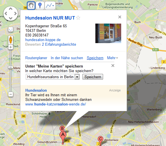 Überfahren Sie eine rote Ortsmarke mit der Maus, blendet Google die Ortsbeschreibung ein. Per Mausklick laden Sie ein Infofeld mit Vorschaubild und weiteren Details. Um den Ort auf der Karte festzuhalten, klicken Sie zunächst auf Speichern. Anschließend können Sie die Adresse automatisch zu Ihrer Karte hinzufügen.