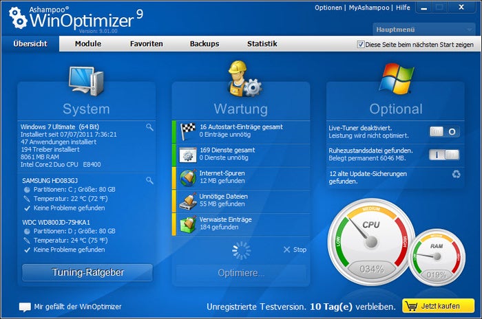 Zum ersten Advent gibt es bei uns heute 10 Vollversionen von Ashampoo WinOptimizer 9. Mit der Software räumt man seinen PC auf und hält das System in Schuss. Das Programm löscht temporäre Internet- und Programmdateien oder ungültige Einträge in der Windows-Registry. Per Benchmark testet man darüber hinaus die Geschwindigkeit des eigenen Rechners.