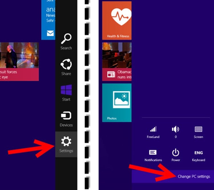 Die Version von Windows auf dem Tablet kann 8 oder RT sein, eventuell auf Windows 8.1 aktualisiert. Um das herauszufinden, wischen Sie einfach mit Ihrem Finger über den Bildschirm von rechts nach links, um die Seitenleiste – genannt Charms Bar – zu aktivieren. Tippen Sie auf das Lupensymbol.