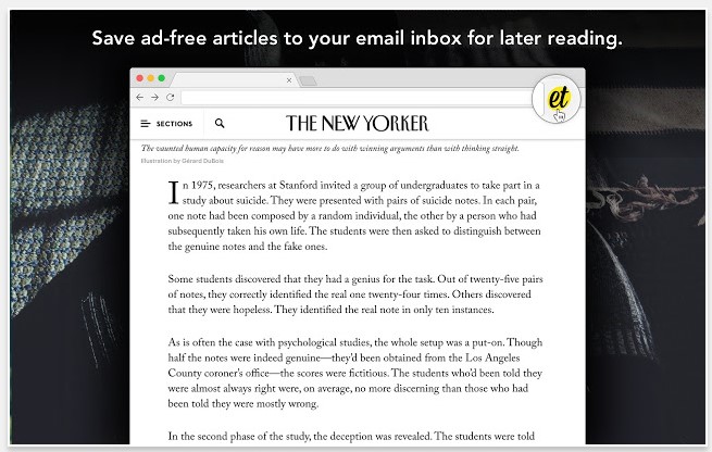 Die Erweiterung Email This speichert werbefreie Versionen von Artikeln, so dass du sie später in Ruhe lesen kannst. Es wird eine E-Mail erstellt, die du dann nach deiner Arbeit lesen kannst. Ganz bequem im Zug auf der Heimfahrt.