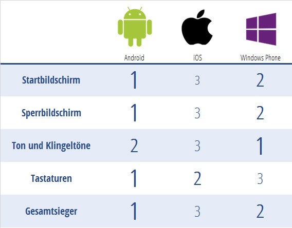 Android schlägt die anderen zwei Betriebssysteme in drei von vier Aspekten. Den zweiten Platz belegt Windows Phone. Das Schlusslicht bildet iOS.