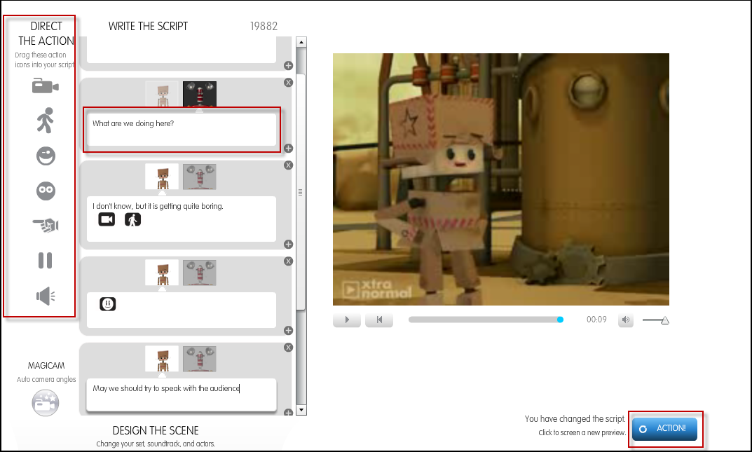 Im nächsten Schritt legt der Hobby-Regisseur Hand an die Szene. Mit Regie-Befehlen in der linken Navigation hat man Kamera, Gesichtsausdrücke, Bewegungen und Töne unter Kontrolle. Per Storyboard fügt man die Steuerelemente mit Drag&Drop in die Zeitleiste ein und ergänzt die Szene um Dialoge. Mit einem Klick auf “Action” wirft man eine Vorschau auf die bisher erstellte Handlung und verfeinert so den Animationsfilm nach und nach. Texte gibt die Webanwendung nur mit englischen Computerstimmen aus, so dass deutsche Dialoge ziemlich merkwürdig klingen. Es empfiehlt sich, als Sprache Englisch zu verwenden.