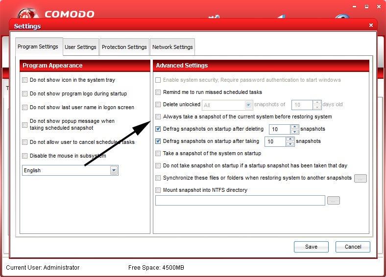Da jeder Snapshot schnell mehrere hundert Megabyte beansprucht, begnügt man sich zur bloßen Datensicherung am Besten mit nur ein oder zwei wichtigen Systemzuständen. Bei jedem Zurücksetzen erstellt Comodo Time Machine jedoch automatisch einen neuen Sicherungspunkt, den man eigentlich nicht braucht. Dies kann man unter Settings abschalten.