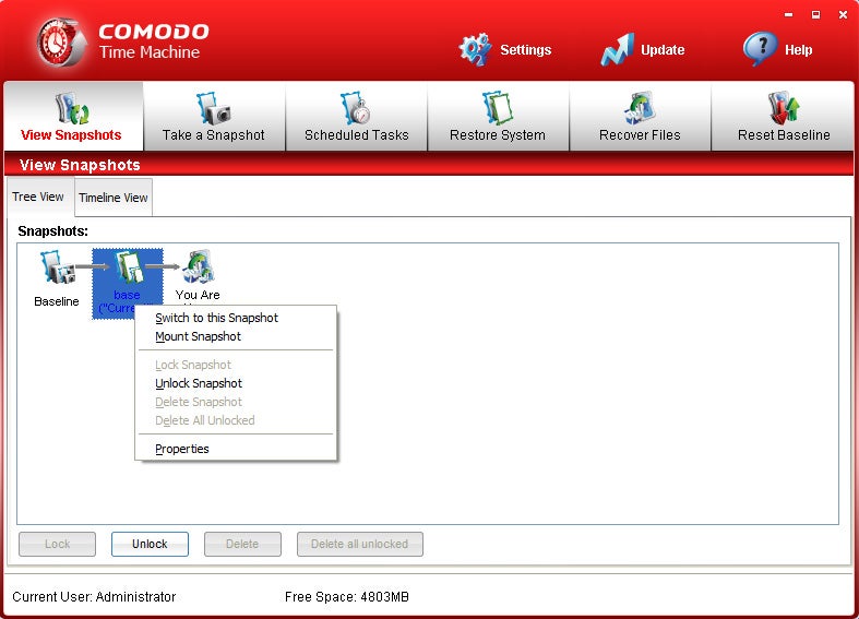 Im unteren Feld sieht man alle gesicherten Systemzustände in chronologischer Reihenfolge. Baseline steht für den Windows-Zustand bei der Installation von Comodo Time Machine. Rechts daneben sieht man selbst erstellte Schnappschüsse. Per rechtem Mausklick auf einen Schnappschuss und Auswahl von Switch to this Snapshot springt man zum jeweiligen Windows-Zustand zurück – voll automatisch.