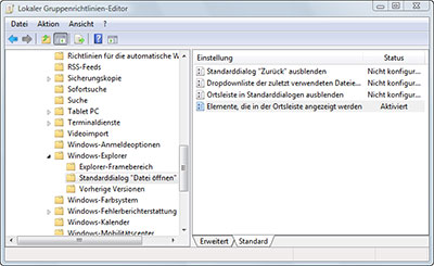 Im daraufhin angezeigten Fenster wählt man links den Pfad Benutzerkonfiguration -> Administrative Vorlagen -> Windows-Komponenten -> Windows-Explorer -> Standarddialog ” Datei öffnen” aus und öffnet rechts per Doppelklick den Eintrag “Elemente, die in der Ortsleiste angezeigt werden”.