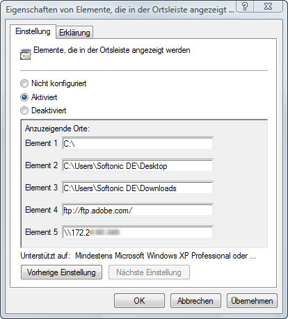 Im nun angezeigten Fenster markiert man Aktiviert und trägt die gewünschten Pfade per Hand ein. Windows erlaubt neben Festplattenordnern ebenfalls externe Laufwerke, lokale Netzwerkpfade und FTP-Server im Internet.