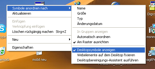Frei nach der Methode Alles Gerümpel in den Schrank und Türe zu versteckt man die Symbole in Sekundenschnelle. Dazu klickt man einfach mit der rechten Maustaste in einen leeren Bereich und deaktiviert unter Symbole anordnen nach die Option Desktopsymbole anzeigen.