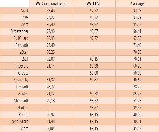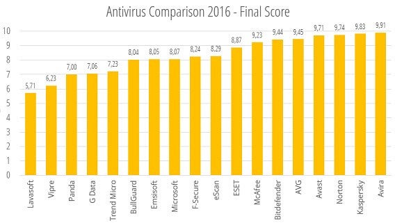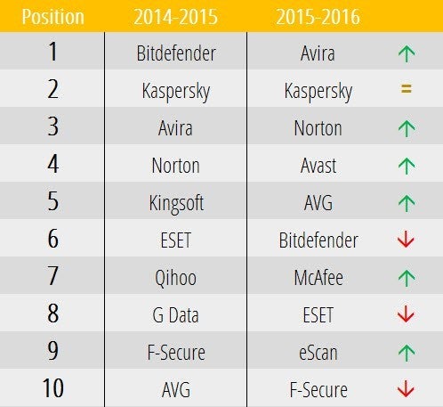 In diesem Jahr liegt Avira in Führung, wobei es gegenüber dem letztjährigen Vergleich um zwei Plätze hochgesprungen ist. Kaspersky belegt zuverlässig den zweiten Platz und bleibt die beste bezahlte Lösung, während Norton um einen Platz aufgestiegen ist.