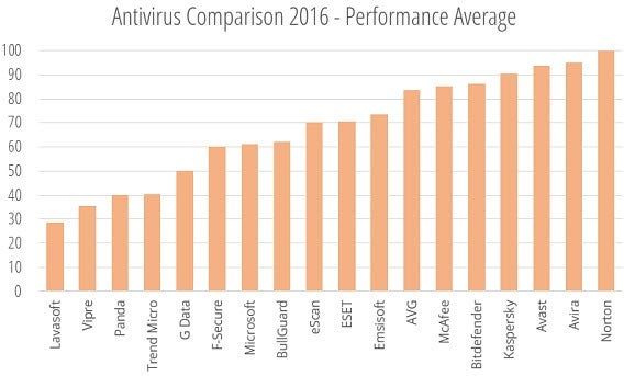 Wie beim Schutz reichen die Punkte für die Leistung von 0 bis 100, wobei eine höhere Punktzahl besser ist. Norton, das nur an einem Leistungsvergleich beteiligt war, belegt den ersten Platz, gefolgt von Avira und Avast. Bei Letzterem gab es eine beachtliche Verbesserung im Vergleich zu den letztjährigen Ergebnissen. Wieder einmal haben wir festgestellt, dass Vipre und Lavasoft, diesmal im Test auf Schutz, wie im letzten Jahr die Nachhut bilden.