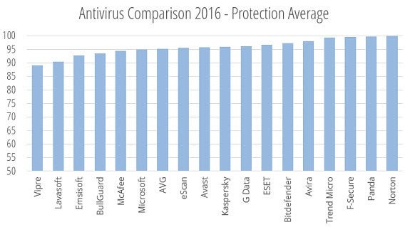 Die für den Schutz vergebenen Punkte reichen von 0 bis 100, wobei eine höhere Punktzahl besser ist. Die Antivirus-Programme, die in Bezug auf den Schutz am besten abschneiden, sind Norton, Panda und F-Secure. Abgesehen davon nimmt Norton, wie auch im letzten Jahr, weder an AV-Comparatives noch an VB teil. Die Leistung von Microsoft ist mittelmäßig, während Vipre und Lavasoft die Nachhut bilden.