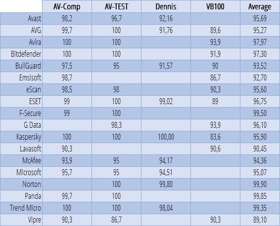Wie auch letztes Jahr haben wir die Ergebnisse von vier unabhängigen Vergleichswebsites gesammelt und analysiert. Unsere Auswahl von Antivirus-Programmen ist auf diejenigen beschränkt, deren Abfragedaten in mindestens zwei Vergleichen auftauchten.
