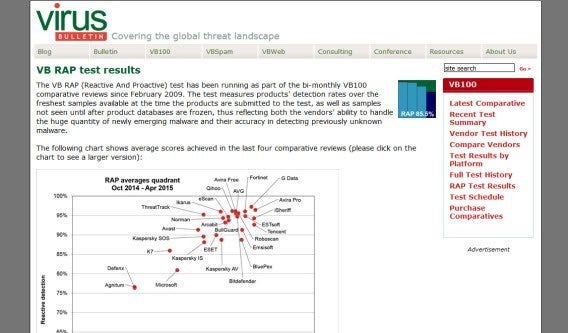 Seit 1989 ist VB einer der führenden Experten in der Antivirus- und Malware-Analyse. Sein Antivirus-Index, VB100, unterliegt einer strengen Prüfung, bei der weder falsche Alarme noch Fehlversuche erlaubt sind. Wir haben die reaktiven und proaktiven (RAP) Detektionsdaten genommen, welche den Anteil an unbekannten Viren messen, die erfolgreich blockiert wurden.