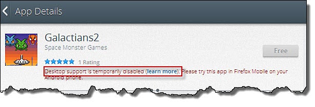 Klicken Sie sich durch die Kategorien und wählen Sie eine Web App, beispielsweise Galactians2 in der Kategorie Games. Sie sehen die Meldung Desktop support is temporarily disabled (learn more). Klicken Sie auf learn more.