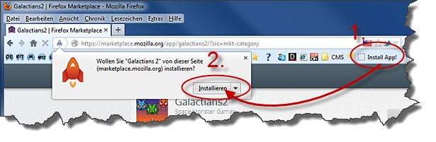 Surfen Sie mit dem Zurück-Button im Browser zurück zur gewählten App. Klicken Sie nun auf das neue Lesezeichen Install App! Firefox fragt Sie, ob Sie die App installieren möchten. Klicken Sie Installieren.