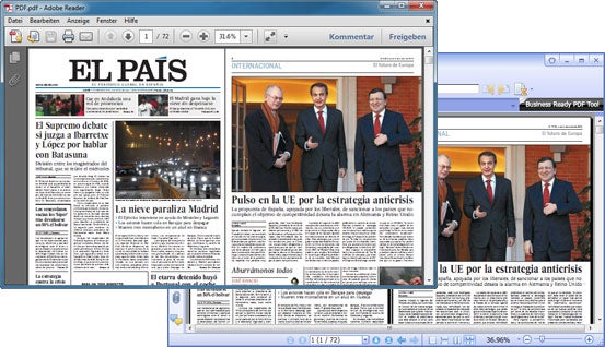 Adobe Reader galt lange als pomadig und träge. Der Hersteller hat seinem PDF-Standardwerkzeug mittlerweile tüchtig Beine gemacht und die Ladegeschwindigkeit und Seitennavigation spürbar verbessert. Darüber hinaus überzeugt an Adobe Reader die aufgeräumte Oberfläche, die gegenüber Foxit PDF Reader etwas ansprechendere Abbildung von Formularen und die schärfere Darstellung einiger PDF-Dokumente.