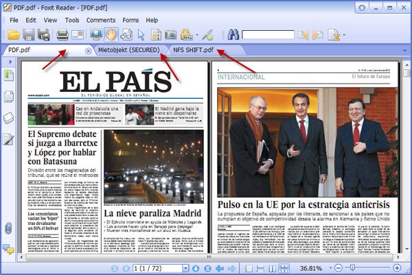 Der leichtgewichtige Foxit Reader zeichnet sich durch seine rasche Arbeitsgeschwindigkeit aus. Mit der praktischen Tab-Ansicht wechselt man blitzartig zwischen mehreren geöffneten PDFs hin und her. Die automatische Scrollfunktion fährt geschmeidig durch den Text. Die praktische Funktion wäre noch besser, wenn sie sich an die Lesegeschwindigkeit des Nutzers anpassen ließe.