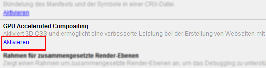 Anschließend klickt man bei den Einträgen GPU Accelerated Compositing und GPU Accelerated Canvas auf Aktivieren. Nach einem Neustart nutzt Chrome noch mehr Rechenpower für 2D Grafik auf Basis von HTML5 Canvas und 3D Effekte mit CSS. Treten danach Probleme mit Chrome auf, nimmt man die Änderung einfach wieder zurück.
