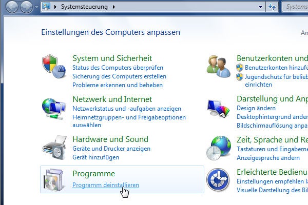 1. Zunächst geht es über Start zur Systemsteuerung. Unter dem Punkt Programme findet man den Eintrag Programme deinstallieren.