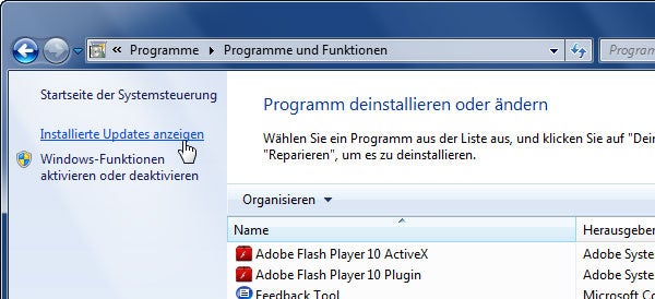 2. Leider ist der Internet Explorer 9 nicht in der Liste zu finden, weil Windows ihn als Update in das System eingefügt hat. Deshalb klickt man auf Installierte Updates anzeigen.