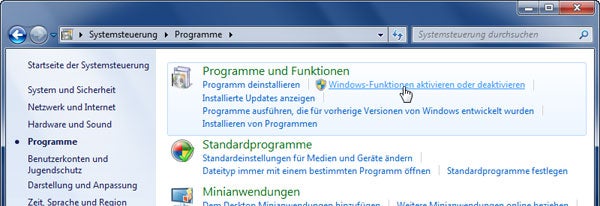 5. Wie im ersten Schritt geht man in die Systemsteuerung und wählt diesmal direkt den Punkt Programme. Im folgenden Fenster klickt man auf Windows-Funktionen aktivieren oder deaktivieren.