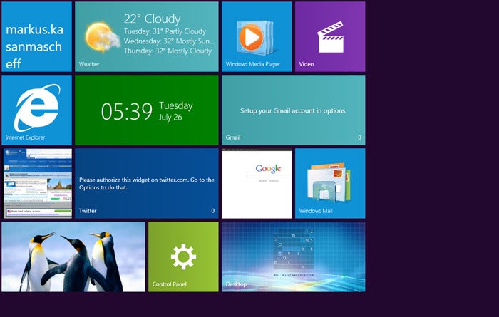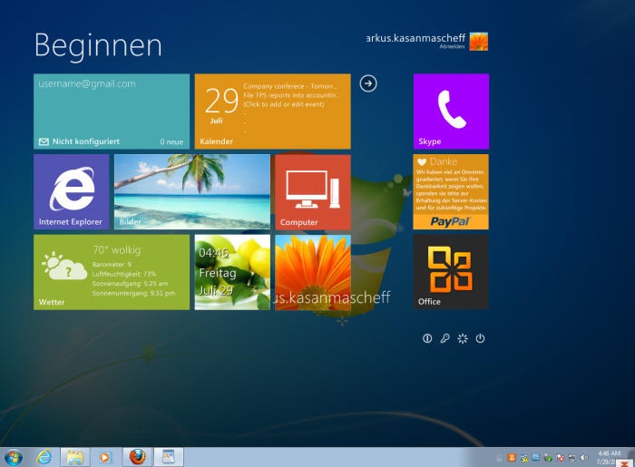 In Sachen Installation sticht das Windows 8 UX Pack dagegen hervor: Das ebenfalls kostenlose Theme schont die Nerven und installiert sich vollkommen automatisch. Während der Einrichtung kann man sich eines von zwei Wallpapers aussuchen und zwischen der neuen Windows 8 Metro-Oberfläche oder der gewohnten Aero-Oberfläche wählen. Auch hier sind die Kacheln einstellbar: nach der Eingabe der persönlichen Zugänge blendet das Windows 8 UX Pack etwa neue Twitter-Nachrichten oder den Posteingang von Google Mail ein.