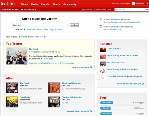 Last.fm ist das wohl bisher bekannteste Musikportal. Hier findet man zahlreiche Infos rund um seine Lieblingskünstler. Die Hauptfunktion liegt auch hier im Entdecken neuer Musik, die Seite nennt sich selbst Empfehlungsservice für Musik. So spielt das Last.fm-Radio nicht nur einen bestimmtem Musiktitel der gesuchten Band, sondern zusätzlich Stücke ähnlicher Künstler ab. Entdecken kann man auch zum eigenen Geschmack passende Festivals und Konzerte.