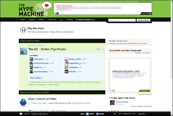 The Hype Machine stellt Musik aus ausgewählten Musikblogs zur Verfügung. Das Portal bietet weniger Funktionen als Grooveshark, liefert aber viele Zusatzinfos zu den Titeln und eignet sich gut für das Entdecken neuer Gruppen. Über verschiedene Funktionen sieht man etwa, was andere Nutzer gerade hören und welche Songs die Musikfans twittern. Zusätzlich zeigt The Hype Machine die Tourdaten der gerade abgespielten Band an.