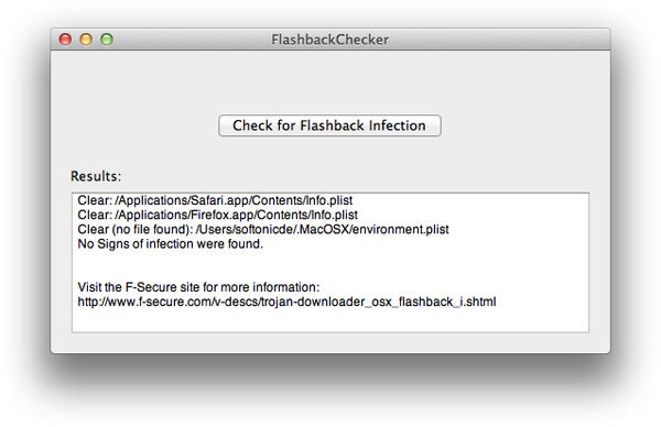 Die Frage, ob der Mac bereits von Flashback infiziert ist, beantwortet die schlichte Anwendung Flashback Checker (Download). Nach dem Download wählen Sie den Befehl Check for Flashback Infection. Das kostenlose Programm führt ein Script aus und teilt Ihnen anschließend mit, ob der Rechner infiziert ist oder nicht. Im Fall eines Fundes entfernt Flashback Checker den Trojaner allerdings nicht.