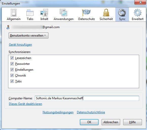 Eine weitere große Neuerung ist Firefox Sync für den Abgleich von Lesezeichen, Passwörtern, Einstellungen, Chronik und Tabs für den Einsatz an verschiedenen Rechnern. Das vormalige Add-On ist jetzt fest im Browser integriert. Alle Daten speichert Firefox Sync verschlüsselt auf Mozilla-Servern im Netz. Nach Eingabe eines Passworts kann man von jedem anderen Firefox aus die persönlichen Daten und Einstellungen Nutzen. Dies ist besonders praktisch bei gespeicherten Login-Daten für Webseiten.