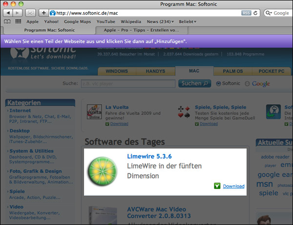 Nun öffnet man die Webseite mit dem gewünschten Element. In unserem Beispiel ist das http://www.softonic.de/mac. Klickt man nun auf den neuen Button, verdunkelt sich die Seite und man kann den gewünschten Webseiten-Teil auswählen. Wir markieren also das Programm des Tages. Ein Klick auf Hinzufügen transferiert die Auswahl automatisch in das Dashboard.