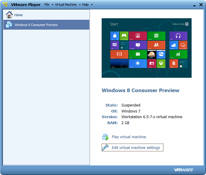 Mit Play virtual machine können Sie die Virtuelle Maschine ganz komfortabel im Fenstermodus starten.